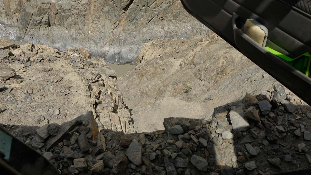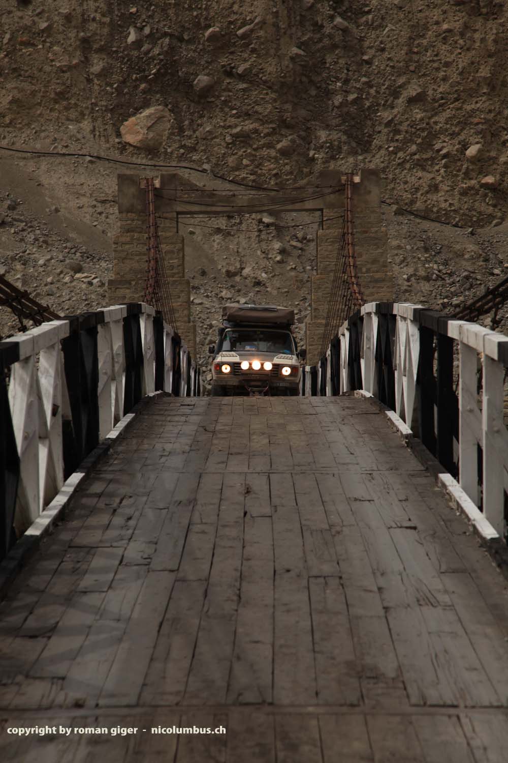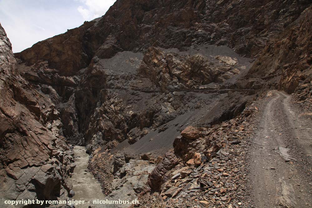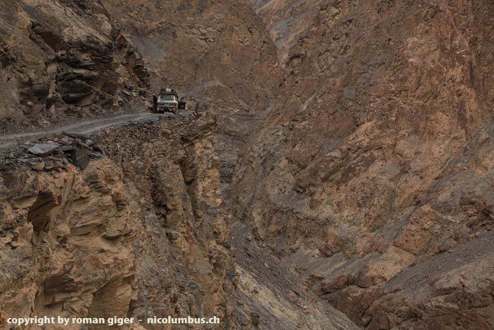 Eine lange Hängebrücke führt über den Hunza hinein in den engen Schlund. Der enge Pfad führt uns seit einer Stunde an Steilwänden entlang. Links geht es senkrecht nach oben. Der Fels leuchtet gelb-braun im Sonnenlicht welches im tosenden Fluss zu unserer Rechten schimmert. Oftmals ist der Pfad sehr eng und Fridolin passt gerade noch durch. Dir Höhe unserer Dachaufbauten zwingen uns immer wieder an den äussersten Rand der Strasse, direkt an den Abgrund welcher manchmal mehrere hundert Meter in die Tiefe führt. Wir diskutieren mehr als ein mal die hiesige Strassenbaukunst. Mörtel, Zement oder gar Asphalt sind hier Fremdwörter. Mehrere Steine werden an der steilen Felswand aufeinander geschichtet bis eine genügend breite Ebene erreicht wird um einen geeigneten Pfad zu errichten. Ziemlich beängstigend, aber wir haben auch en gutes Vertrauen. Sogar "Ober-Höhen-Schisshase" Giger meistert die Strasse, auch für mich, sehr erstaunlich gut. Ich habe keine grossen Mühen, auch wenn ich vom Seitenfenster direkt in die Tiefe blicken kann oder muss.