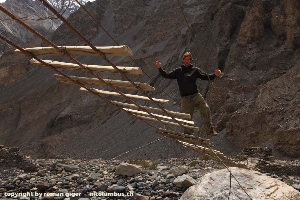 Wir treffen auch auf eine typisch Pakistanische Fussgänger-Hängebrücke. Diese besteht aus fünf Stahlseilen und hat als Trittfläche halbierte Baumäste welche wenn man Glück hat alle 50-100cm in die Stahlseile gespannt sind. Perfekte Therapie für Höhenangst-Patienten!!!!!!