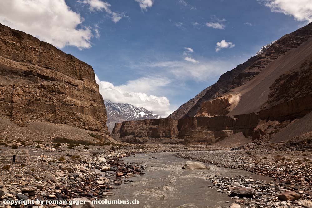 Im Hintergrund sehen wir Schneeberge, rechts und links von uns sind gewaltige Sand- und Fels-Hügel welche von der seismischen Aktivität dieser Gegend zeugen. Überall sind Abgangzonen von riesigen Felsrutschen zu sehen. Ein zerklüfteter Canyon führt dem Fluss entlang in beide Richtungen des Tal's. Überwältigend.
