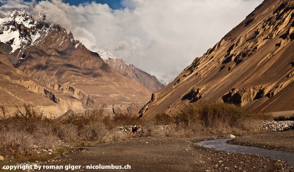 Das Ende der Strasse wird vom Dorf Shimsal markiert und dieses befindet sich noch im Winterschlaf so scheint es. Idyllisch liegt das Dorf auf einer grünen Anhöhe über dem nun urplötzlich breiten Flussbett. Überall blühen Kirsch- und Aprikosenbäume in voller Pracht. Die aus Flusssteinen gebauten, einfachen Häuser sind von Kilometer langen Stein-Zäunen umgeben. Dieses ausgeklügelte Netz von Flussstein-Mauer mit Dornbusch-Toren soll die Nutztiere von Feldern und Haus und Hof fern halten.